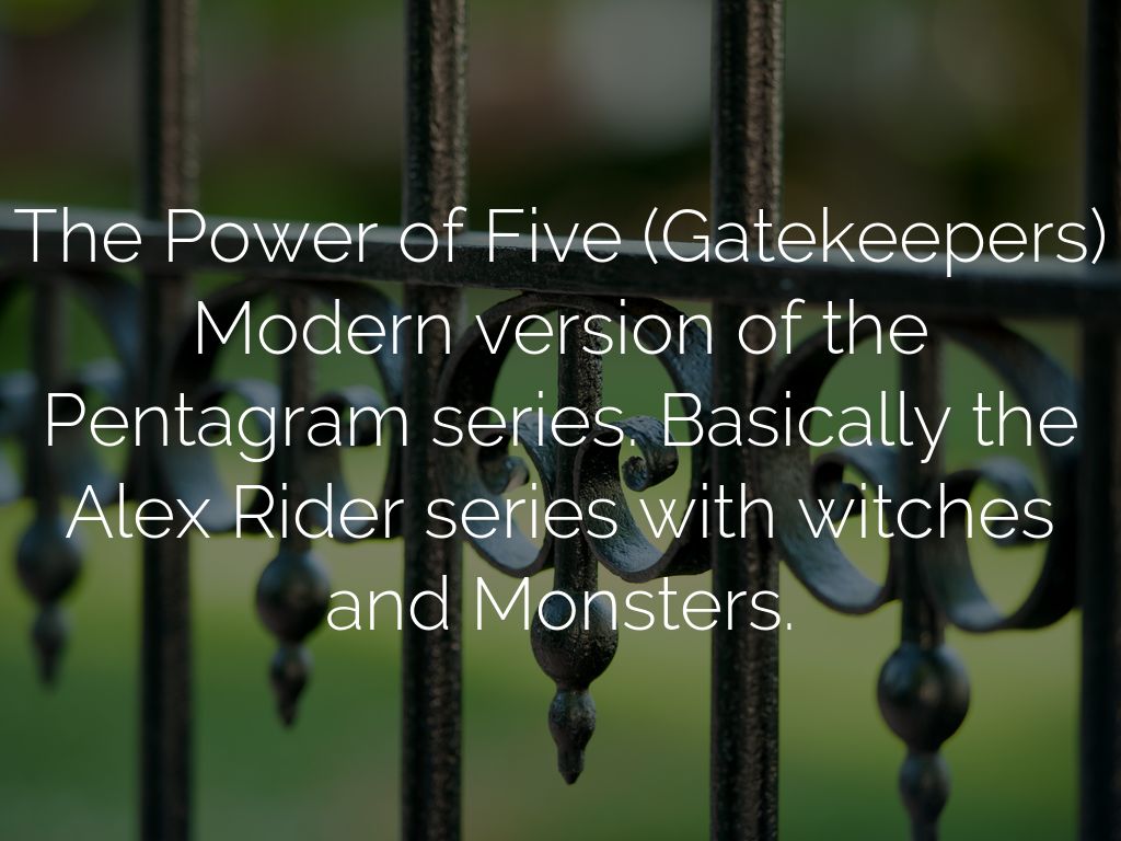 The Power of Five (Gatekeepers) Modern version of the Pentagram series. Basically the Alex Rider series with witches and Monsters.