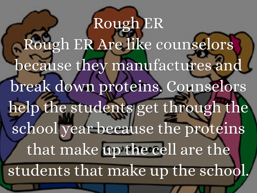 Rough ER Are like counselors because they manufactures and break down proteins. Counselors help the students get through the school year because the proteins that make up the cell are the students that make up the school.
