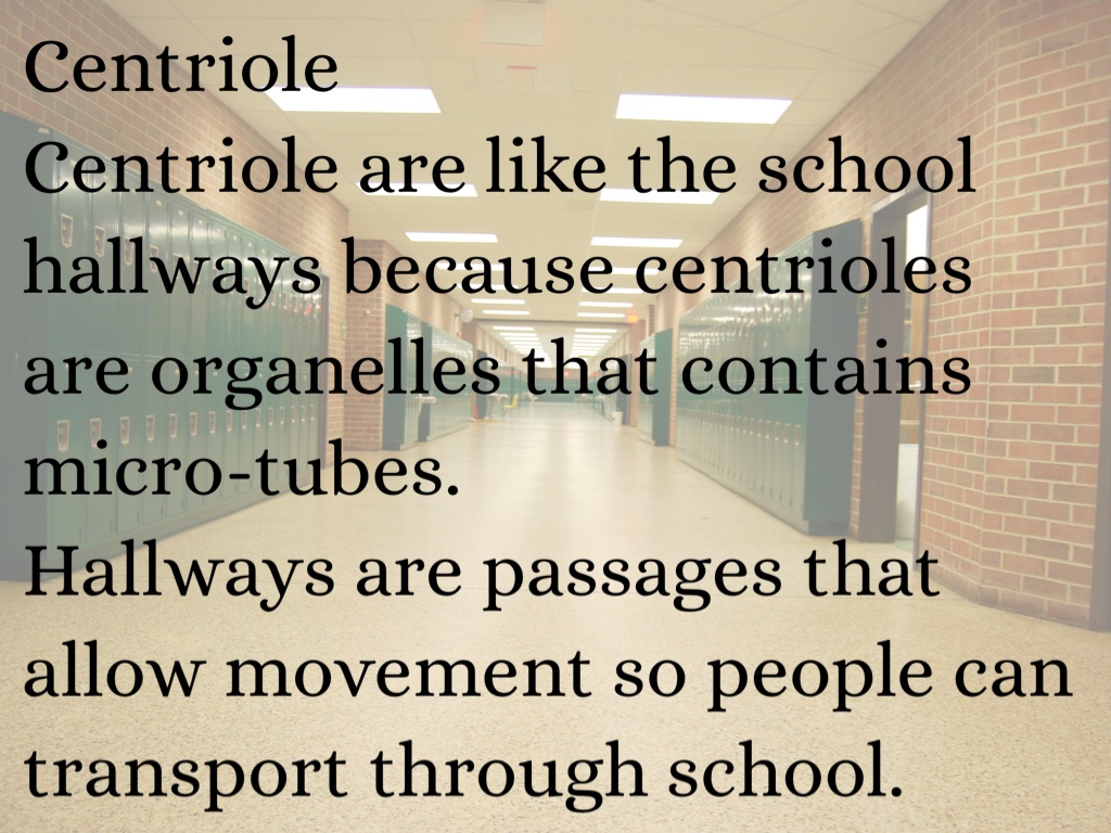 Centriole are like the school hallways because centrioles are organelles that contains micro-tubes.
