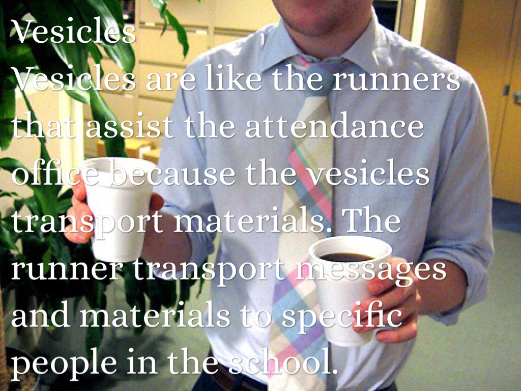 Vesicles are like the runners that assist the attendance office because the vesicles transport materials. The runner transport messages and materials to specific people in the school.