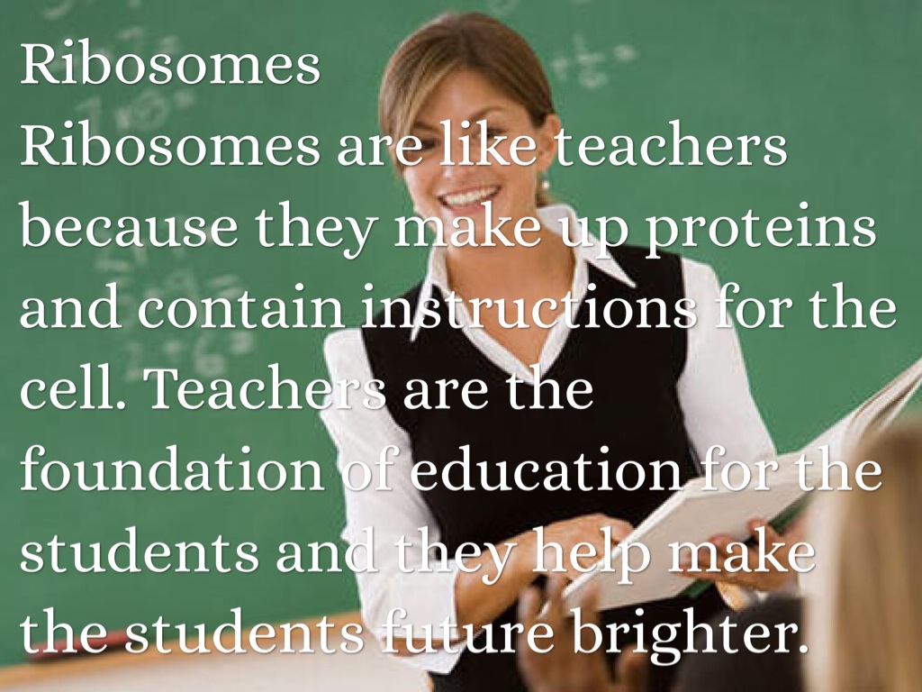 Ribosomes are like teachers because they make up proteins and contain instructions for the cell. Teachers are the foundation of education for the students and they help make the students future brighter.