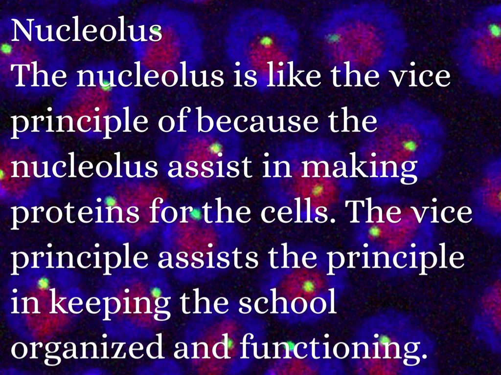The nucleolus is like the vice principle of because the nucleolus assist in making proteins for the cells. The vice principle assists the principle in keeping the school organized and functioning.