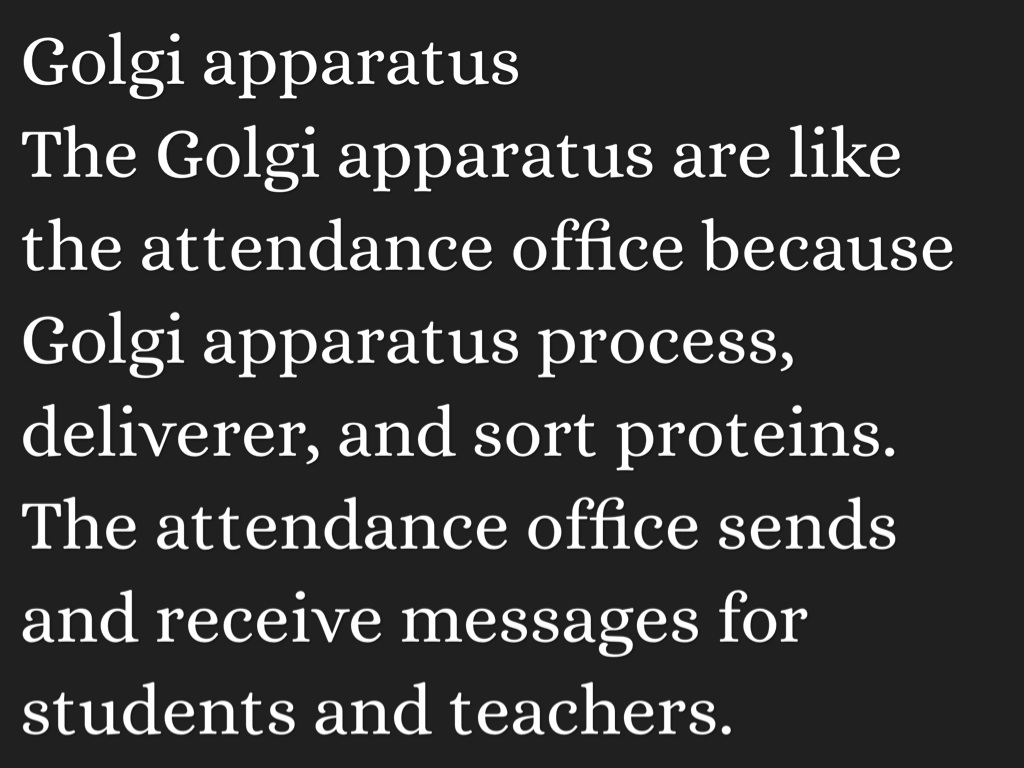 The Golgi apparatus are like the attendance office because Golgi apparatus process, deliverer, and sort proteins. The attendance office sends and receive messages for students and teachers.