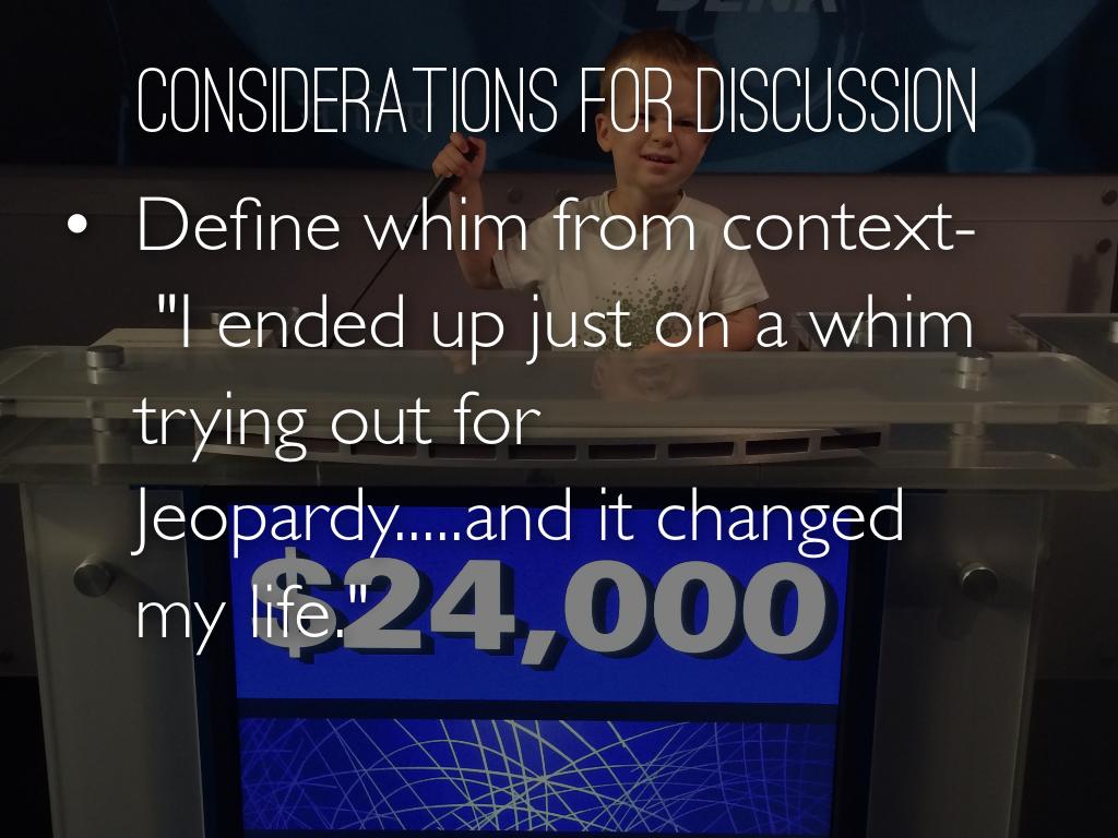 Define whim from context- "I ended up just on a whim trying out for Jeopardy.....and it changed my life."