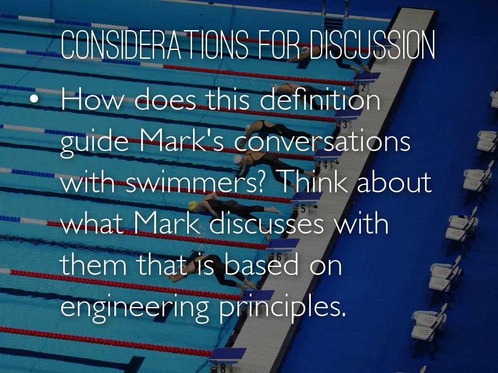 How does this definition guide Mark's conversations with swimmers? Think about what Mark discusses with them that is based on engineering principles.