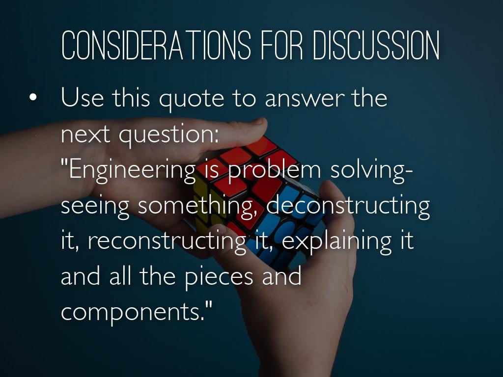 Use this quote to answer the next question: "Engineering is problem solving- seeing something, deconstructing it, reconstructing it, explaining it and all the pieces and components."