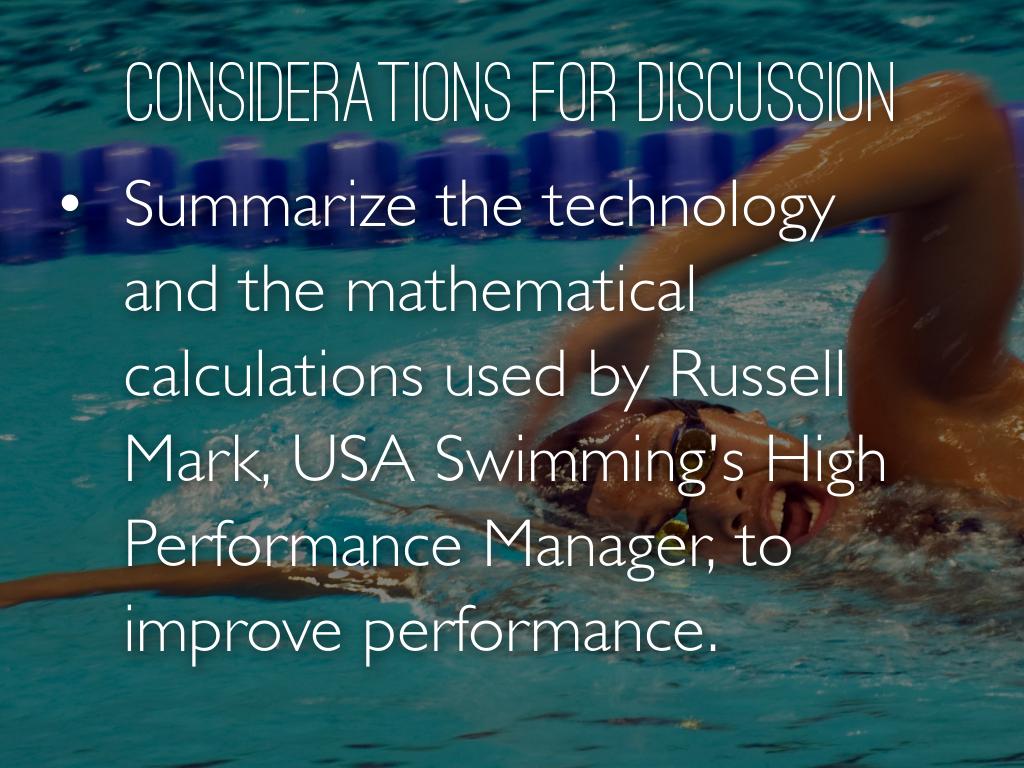 Summarize the technology and the mathematical calculations used by Russell Mark, USA Swimming's High Performance Manager, to improve performance.