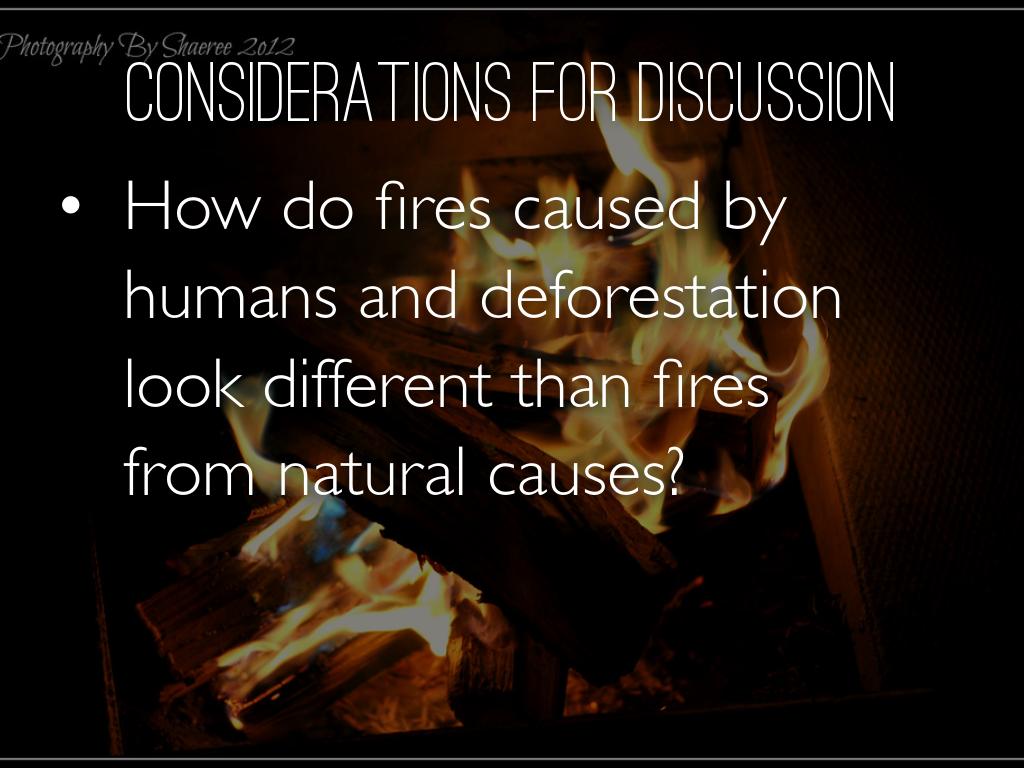 How do fires caused by humans and deforestation look different than fires from natural causes?