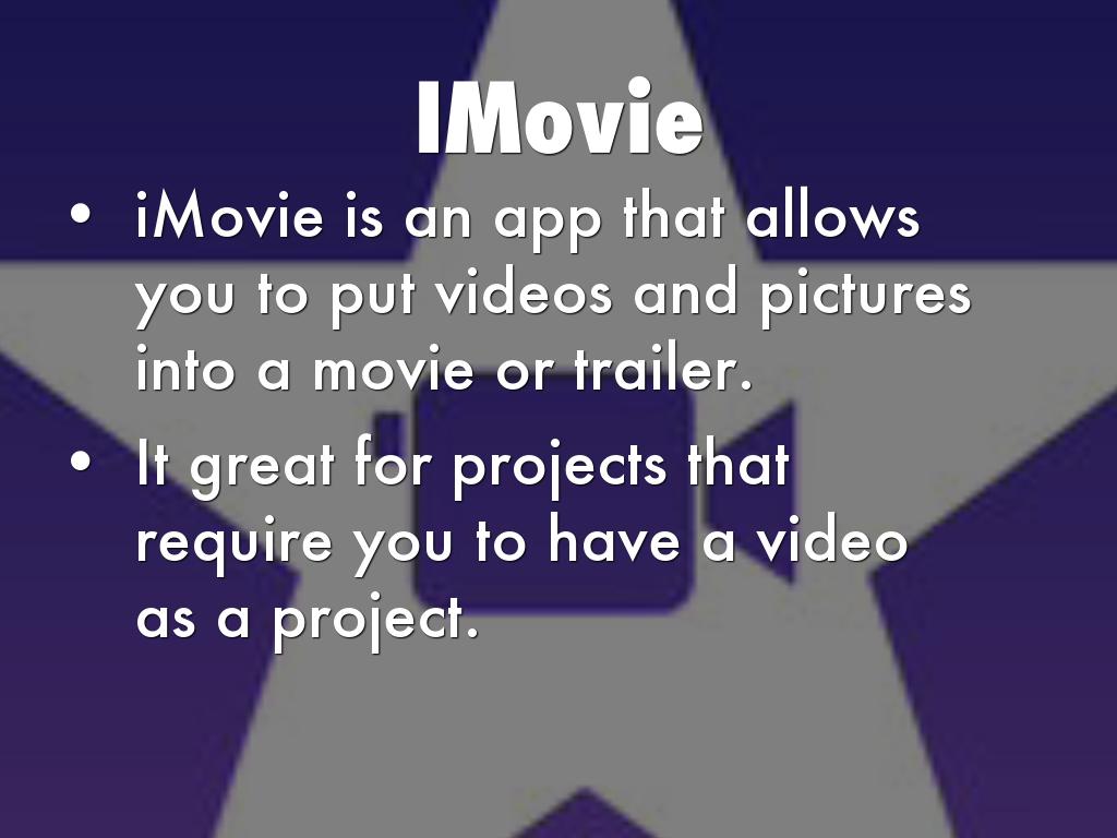 iMovie is an app that allows you to put videos and pictures into a movie or trailer.