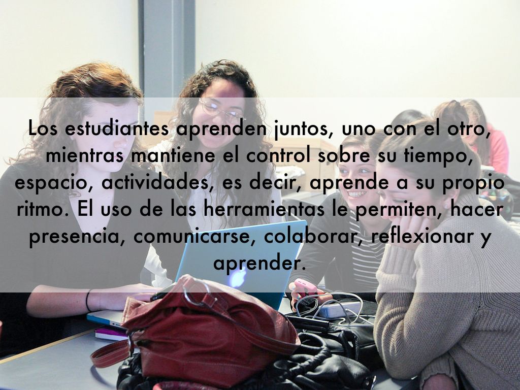 Los estudiantes aprenden juntos, uno con el otro, mientras mantiene el control sobre su tiempo, espacio, actividades, es decir, aprende a su propio ritmo. El uso de las herramientas le permiten, hacer presencia, comunicarse, colaborar, reflexionar y aprender.