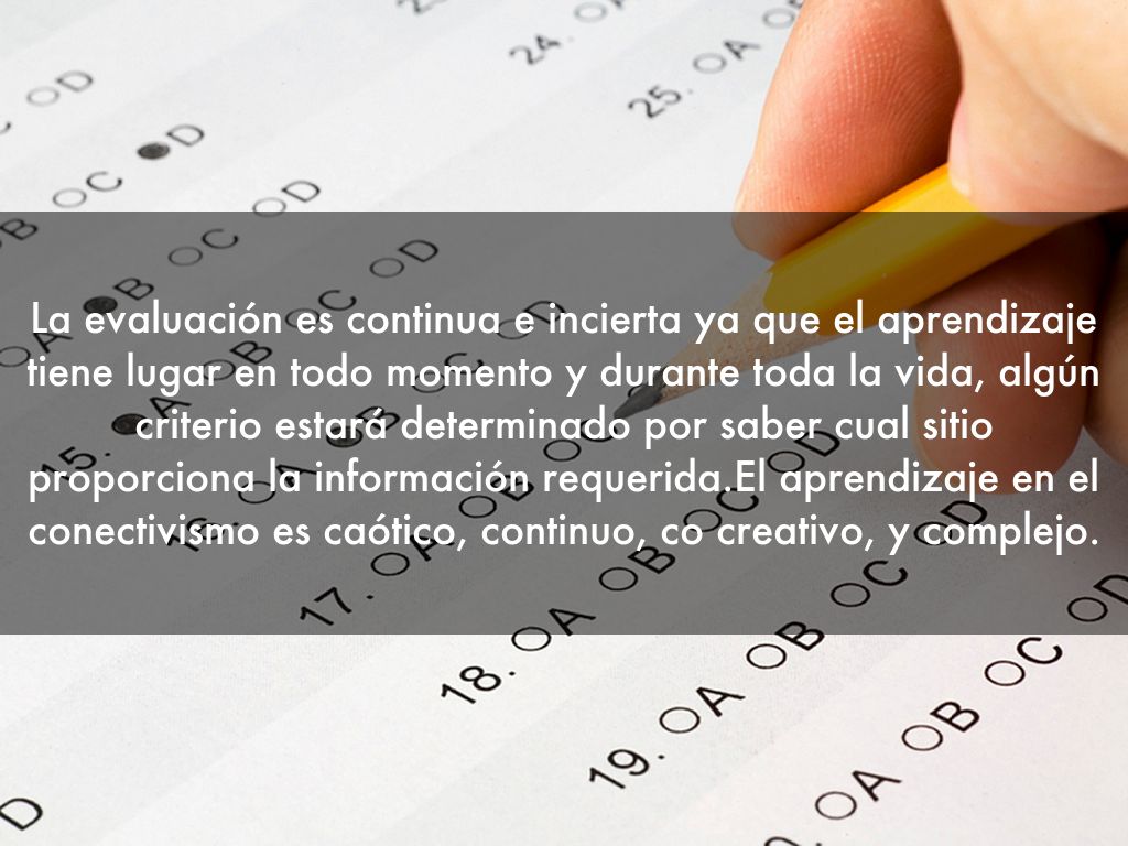 La evaluación es continua e incierta ya que el aprendizaje tiene lugar en todo momento y durante toda la vida, algún criterio estará determinado por saber cual sitio proporciona la información requerida.El aprendizaje en el conectivismo es caótico, continuo, co creativo, y complejo.