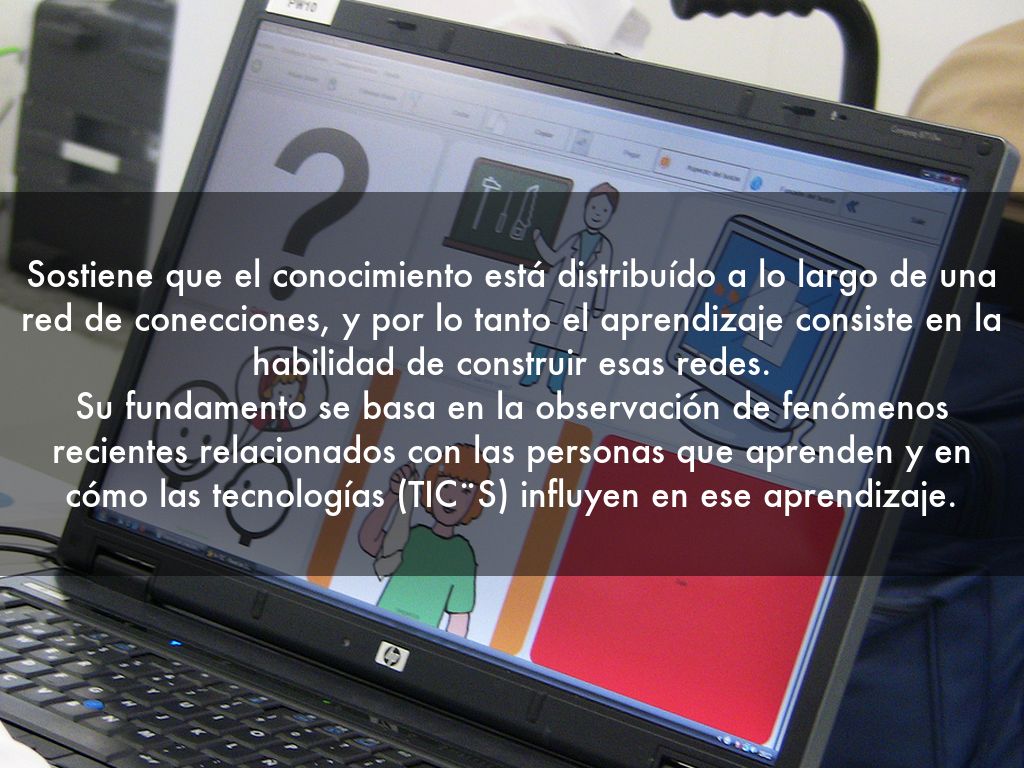 Sostiene que el conocimiento está distribuído a lo largo de una red de conecciones, y por lo tanto el aprendizaje consiste en la habilidad de construir esas redes. Su fundamento se basa en la observación de fenómenos recientes relacionados con las personas que aprenden y en cómo las tecnologías (TIC¨S) influyen en ese aprendizaje.