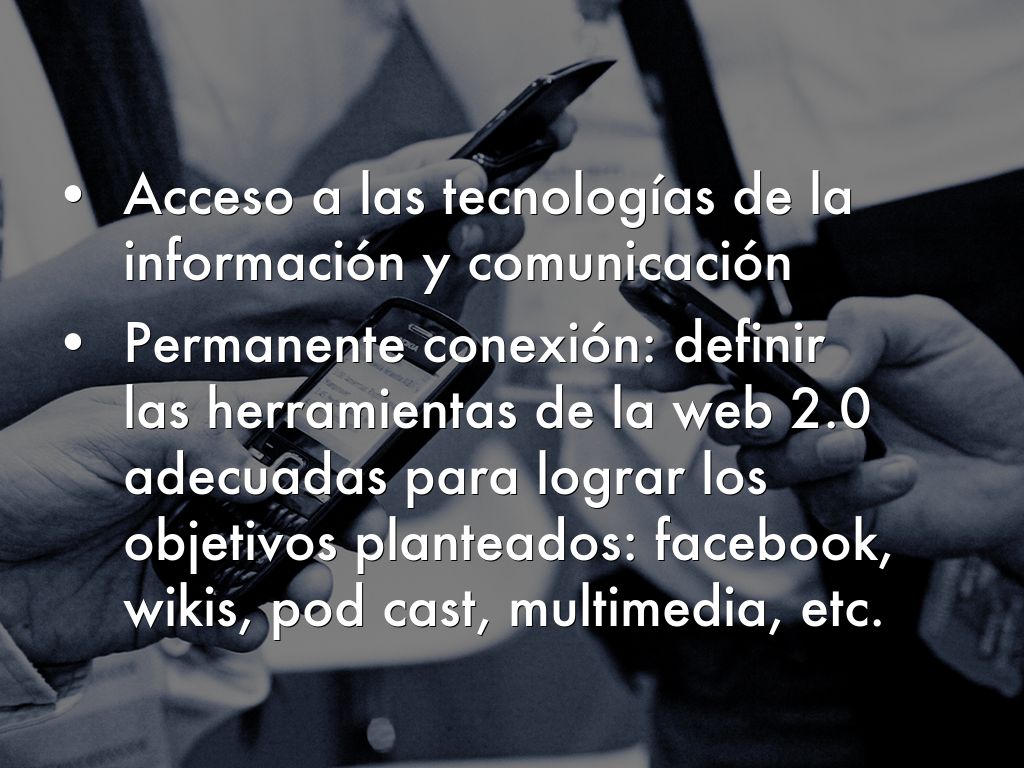 Permanente conexión: definir las herramientas de la web 2.0 adecuadas para lograr los objetivos planteados: facebook, wikis, pod cast, multimedia, etc.