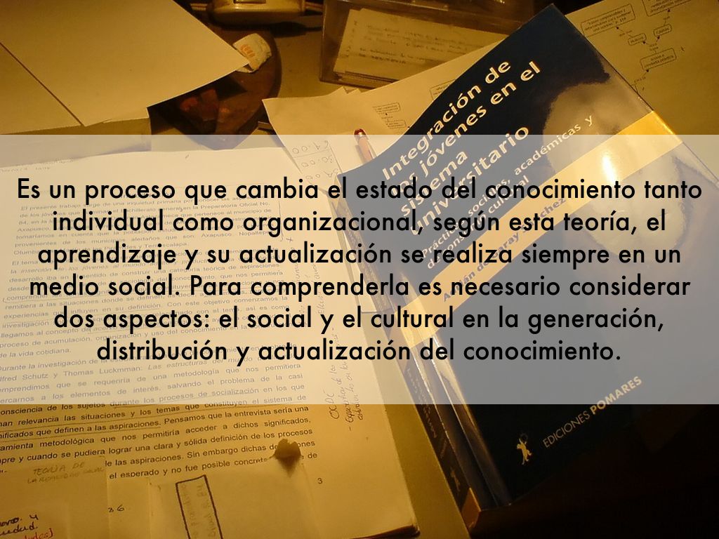 Es un proceso que cambia el estado del conocimiento tanto individual como organizacional, según esta teoría, el aprendizaje y su actualización se realiza siempre en un medio social. Para comprenderla es necesario considerar dos aspectos: el social y el cultural en la generación, distribución y actualización del conocimiento.