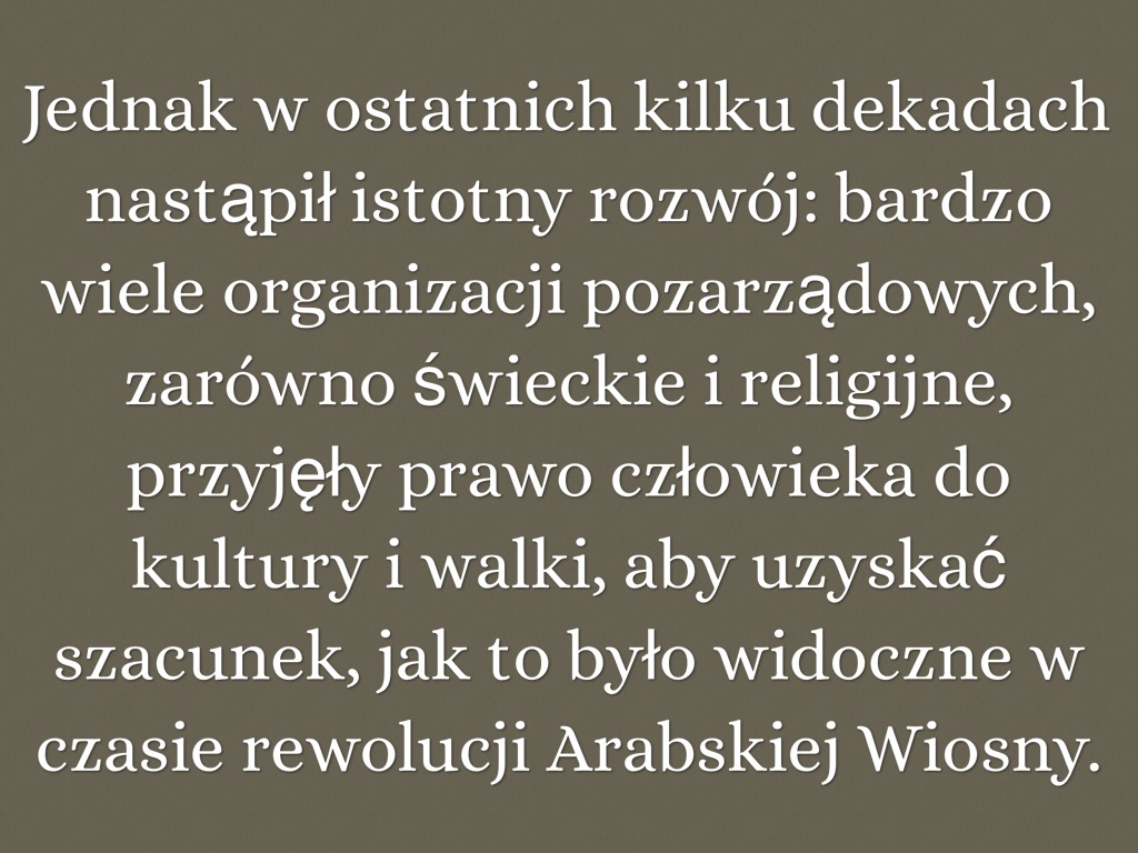 Jednak w ostatnich kilku dekadach nastąpił istotny rozwój: bardzo wiele organizacji pozarządowych, zarówno świeckie i religijne, przyjęły prawo człowieka do kultury i walki, aby uzyskać szacunek, jak to było widoczne w czasie rewolucji Arabskiej Wiosny.