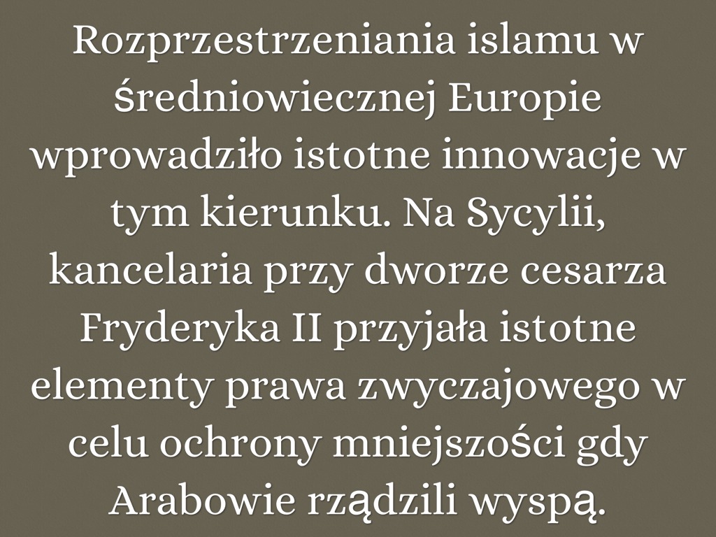 Rozprzestrzeniania islamu w średniowiecznej Europie wprowadziło istotne innowacje w tym kierunku. Na Sycylii, kancelaria przy dworze cesarza Fryderyka II przyjała istotne elementy prawa zwyczajowego w celu ochrony mniejszości gdy Arabowie rządzili wyspą.