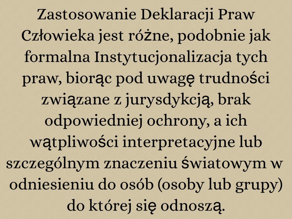 Zastosowanie Deklaracji Praw Człowieka jest różne, podobnie jak formalna Instytucjonalizacja tych praw, biorąc pod uwagę trudności związane z jurysdykcją, brak odpowiedniej ochrony, a ich wątpliwości interpretacyjne lub szczególnym znaczeniu światowym w odniesieniu do osób (osoby lub grupy) do której się odnoszą.
