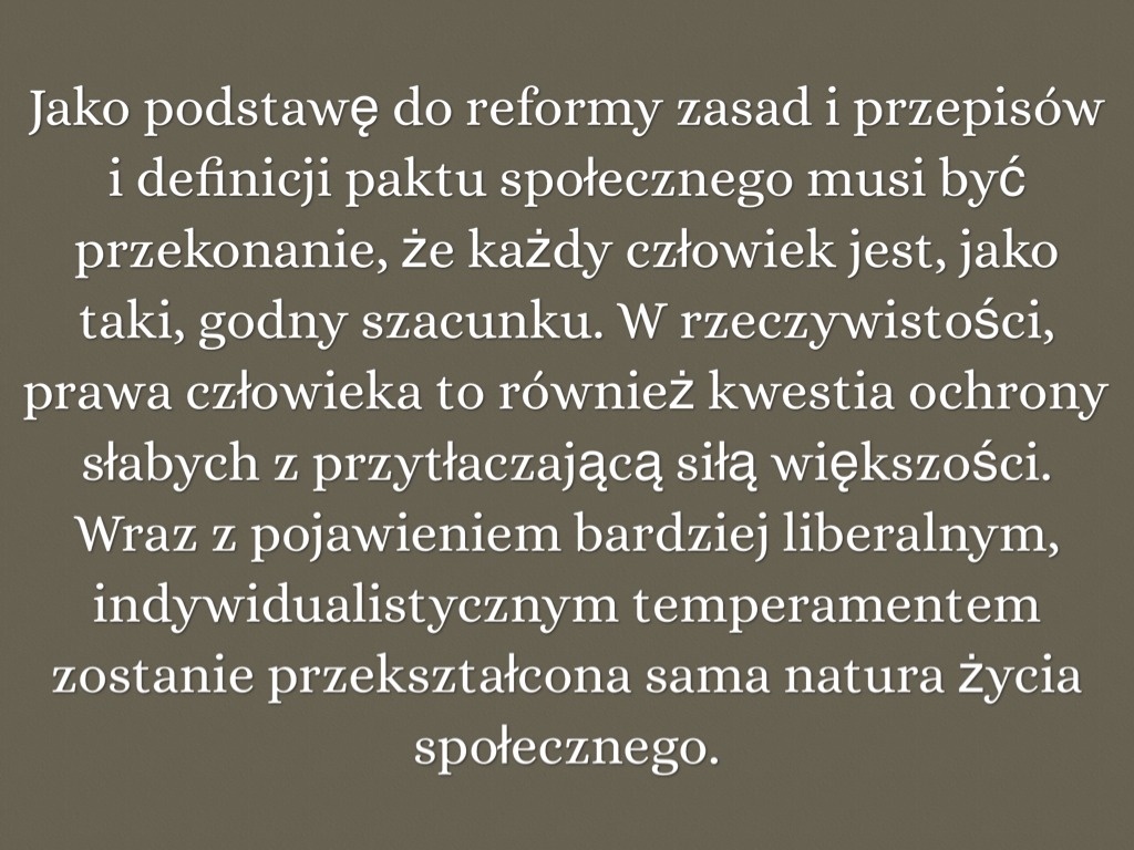 Jako podstawę do reformy zasad i przepisów i definicji paktu społecznego musi być przekonanie, że każdy człowiek jest, jako taki, godny szacunku. W rzeczywistości, prawa człowieka to również kwestia ochrony słabych z przytłaczającą siłą większości. Wraz z pojawieniem bardziej liberalnym, indywidualistycznym temperamentem zostanie przekształcona sama natura życia społecznego.