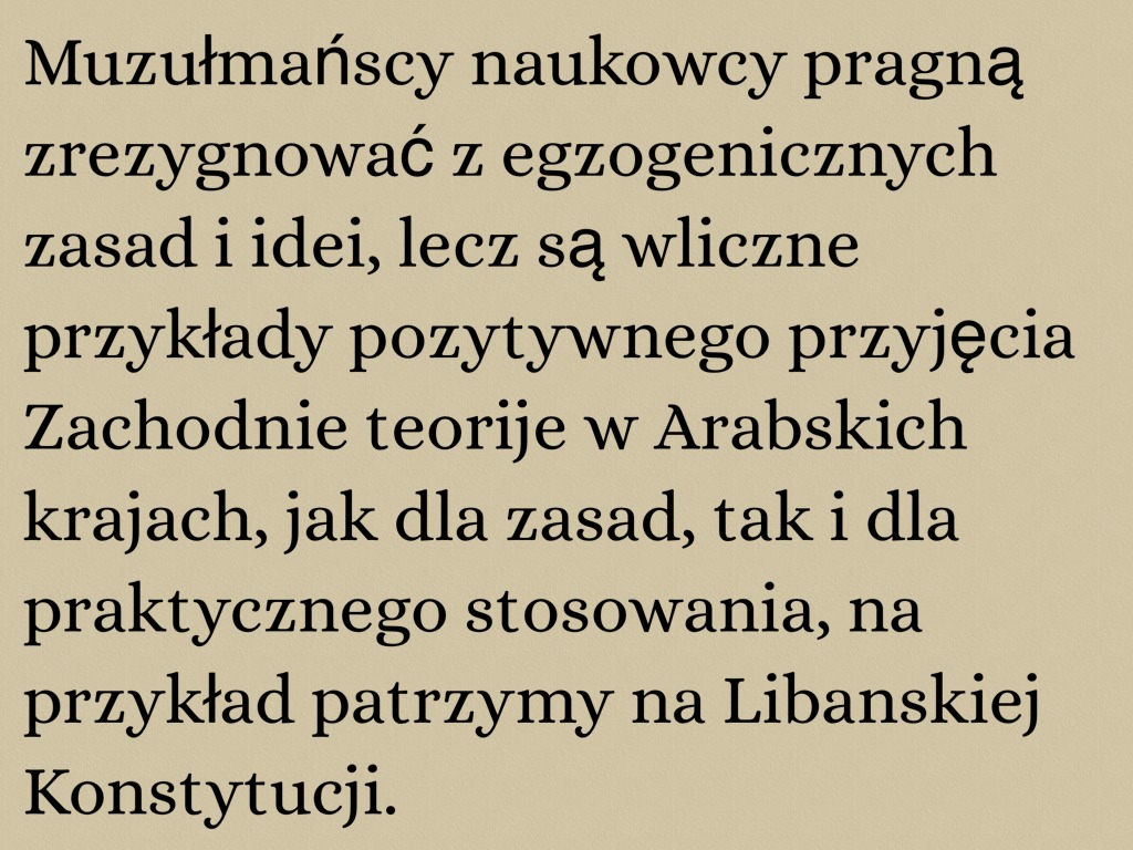 Muzułmańscy naukowcy pragną zrezygnować z egzogenicznych zasad i idei, lecz są wliczne przykłady pozytywnego przyjęcia Zachodnie teorije w Arabskich krajach, jak dla zasad, tak i dla praktycznego stosowania, na przykład patrzymy na Libanskiej Konstytucji.