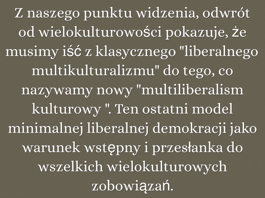 Z naszego punktu widzenia, odwrót od wielokulturowości pokazuje, że musimy iść z klasycznego "liberalnego multikulturalizmu" do tego, co nazywamy nowy "multiliberalism kulturowy ". Ten ostatni model minimalnej liberalnej demokracji jako warunek wstępny i przesłanka do wszelkich wielokulturowych zobowiązań.