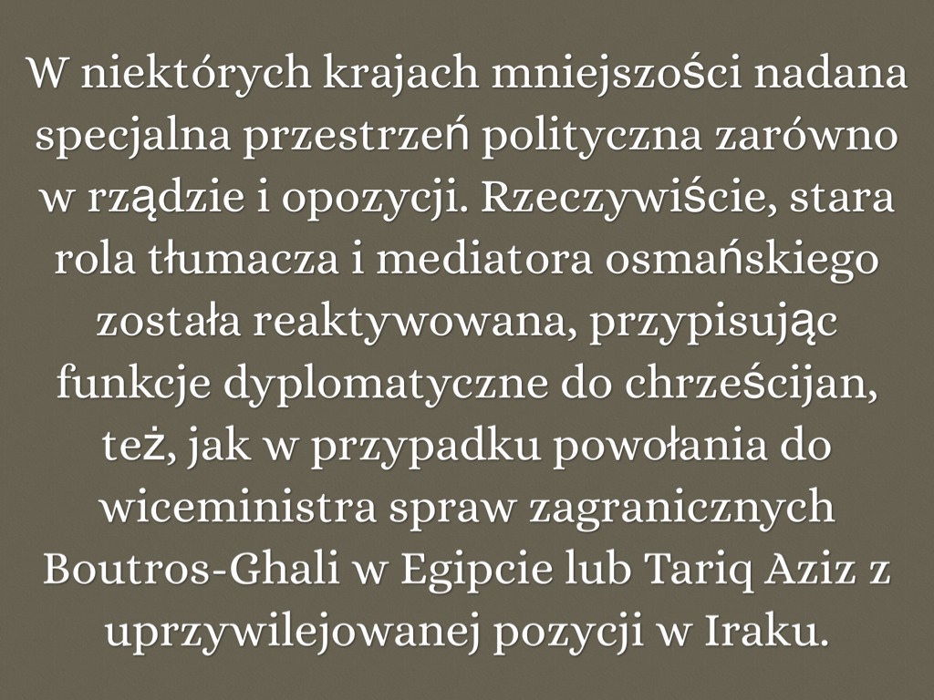 W niektórych krajach mniejszości nadana specjalna przestrzeń polityczna zarówno w rządzie i opozycji. Rzeczywiście, stara rola tłumacza i mediatora osmańskiego została reaktywowana, przypisując funkcje dyplomatyczne do chrześcijan, też, jak w przypadku powołania do wiceministra spraw zagranicznych Boutros-Ghali w Egipcie lub Tariq Aziz z uprzywilejowanej pozycji w Iraku.