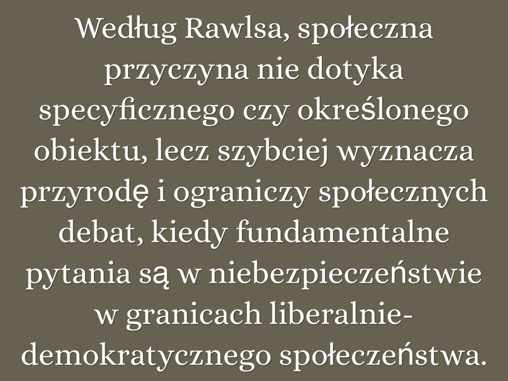 Według Rawlsa, społeczna przyczyna nie dotyka specyficznego czy określonego obiektu, lecz szybciej wyznacza przyrodę i ograniczy społecznych debat, kiedy fundamentalne pytania są w niebezpieczeństwie w granicach liberalnie-demokratycznego społeczeństwa.