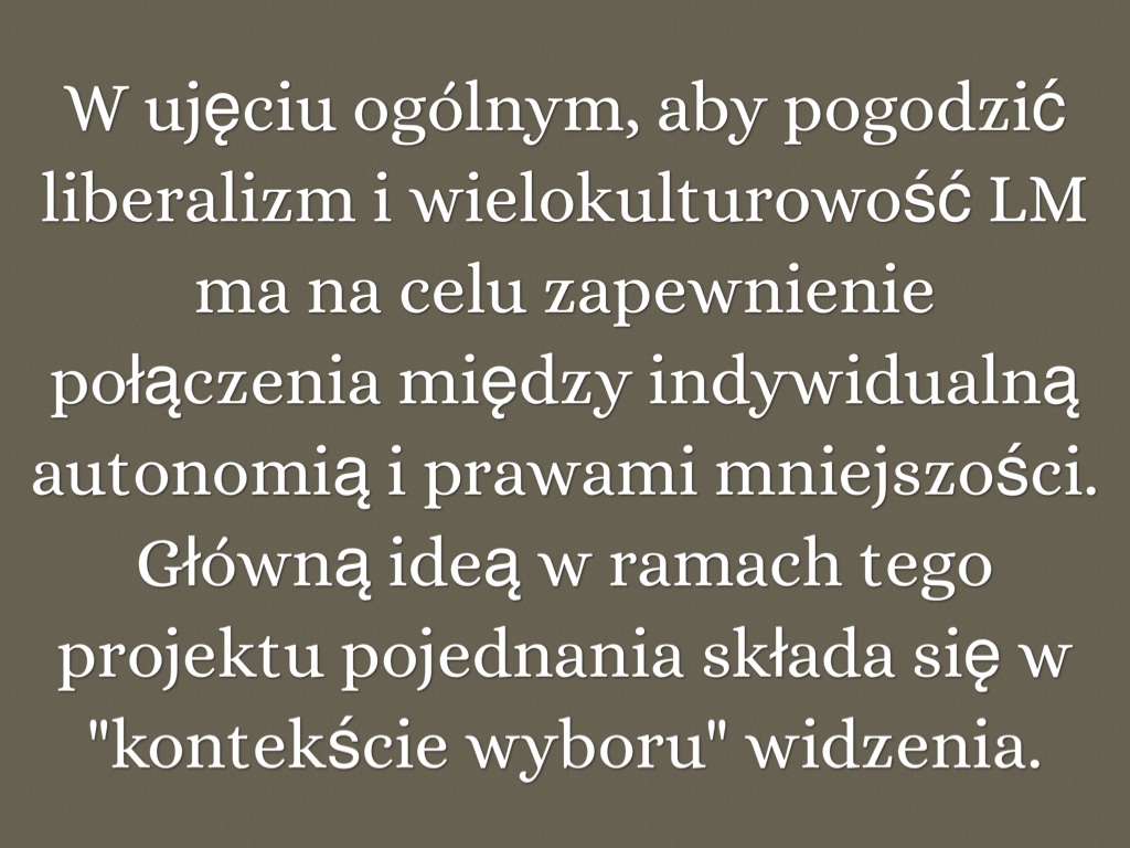 W ujęciu ogólnym, aby pogodzić liberalizm i wielokulturowość LM ma na celu zapewnienie połączenia między indywidualną autonomią i prawami mniejszości. Główną ideą w ramach tego projektu pojednania składa się w "kontekście wyboru" widzenia.