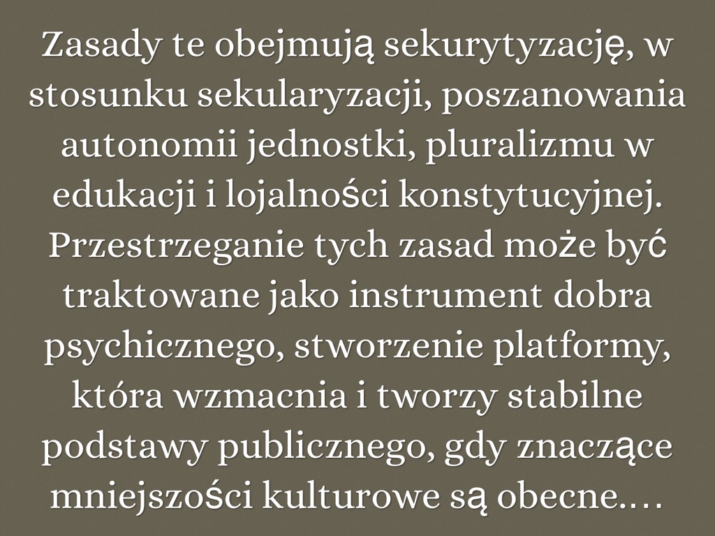 Zasady te obejmują sekurytyzację, w stosunku sekularyzacji, poszanowania autonomii jednostki, pluralizmu w edukacji i lojalności konstytucyjnej. Przestrzeganie tych zasad może być traktowane jako instrument dobra psychicznego, stworzenie platformy, która wzmacnia i tworzy stabilne podstawy publicznego, gdy znaczące mniejszości kulturowe są obecne.