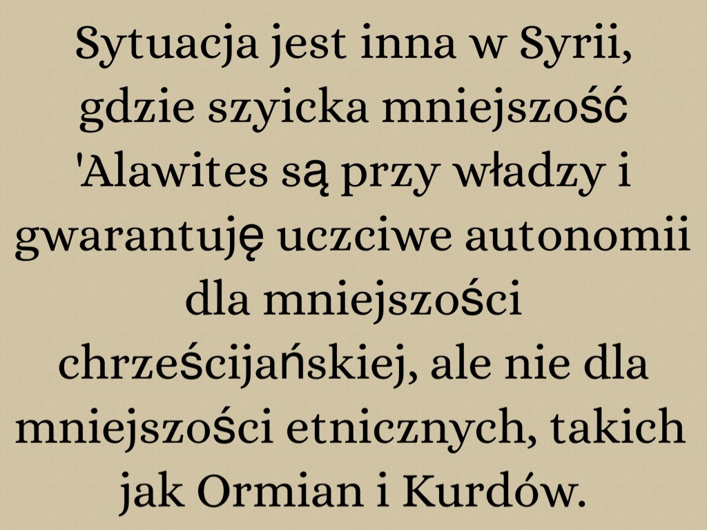 Sytuacja jest inna w Syrii, gdzie szyicka mniejszość 'Alawites są przy władzy i gwarantuję uczciwe autonomii dla mniejszości chrześcijańskiej, ale nie dla mniejszości etnicznych, takich jak Ormian i Kurdów.