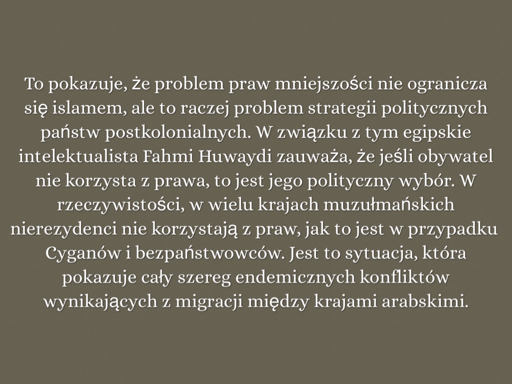 To pokazuje, że problem praw mniejszości nie ogranicza się islamem, ale to raczej problem strategii politycznych państw postkolonialnych. W związku z tym egipskie intelektualista Fahmi Huwaydi zauważa, że jeśli obywatel nie korzysta z prawa, to jest jego polityczny wybór. W rzeczywistości, w wielu krajach muzułmańskich nierezydenci nie korzystają z praw, jak to jest w przypadku Cyganów i bezpaństwowców. Jest to sytuacja, która pokazuje cały szereg endemicznych konfliktów wynikających z migracji między krajami arabskimi.
