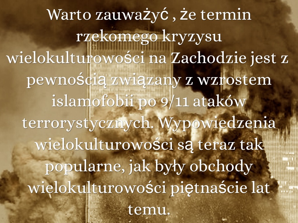 Warto zauważyć , że termin rzekomego kryzysu wielokulturowości na Zachodzie jest z pewnością związany z wzrostem islamofobii po 9/11 ataków terrorystycznych. Wypowiedzenia wielokulturowości są teraz tak popularne, jak były obchody wielokulturowości piętnaście lat temu.