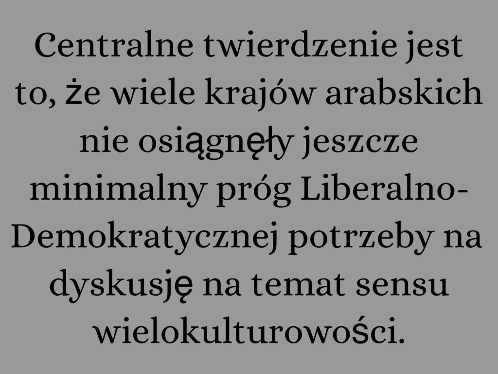 Centralne twierdzenie jest to, że wiele krajów arabskich nie osiągnęły jeszcze minimalny próg Liberalno-Demokratycznej potrzeby na dyskusję na temat sensu wielokulturowości.