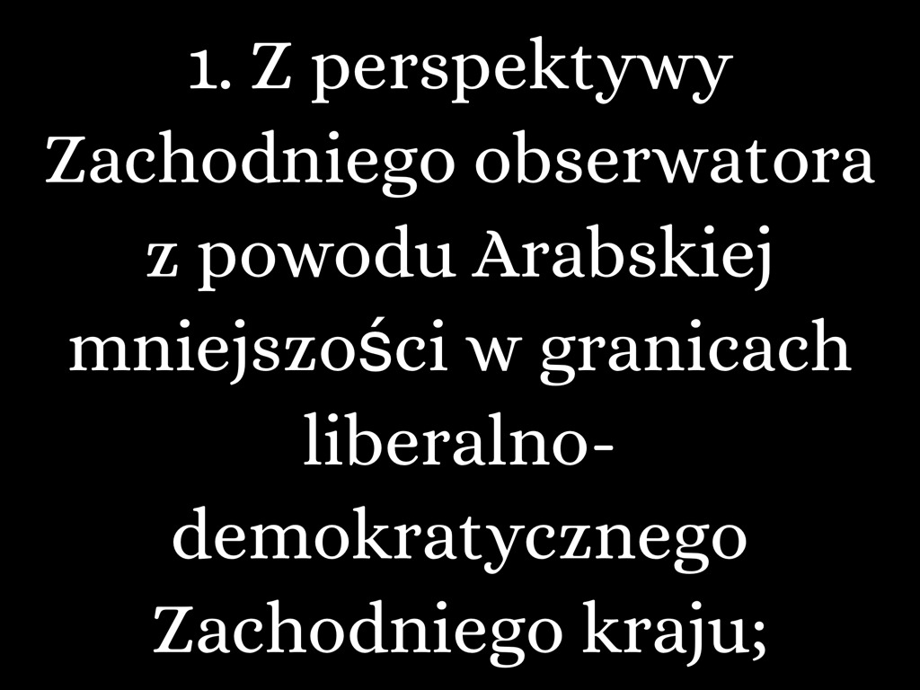 1. Z perspektywy Zachodniego obserwatora z powodu Arabskiej mniejszości w granicach liberalno-demokratycznego Zachodniego kraju;