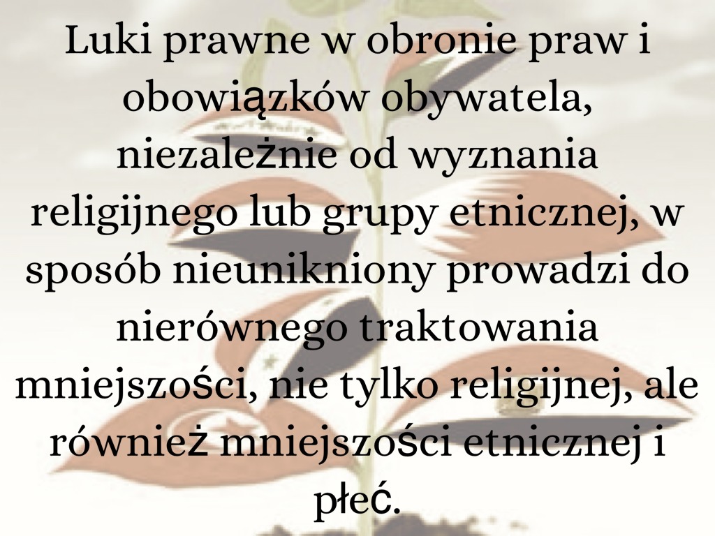 Luki prawne w obronie praw i obowiązków obywatela, niezależnie od wyznania religijnego lub grupy etnicznej, w sposób nieunikniony prowadzi do nierównego traktowania mniejszości, nie tylko religijnej, ale również mniejszości etnicznej i płeć.