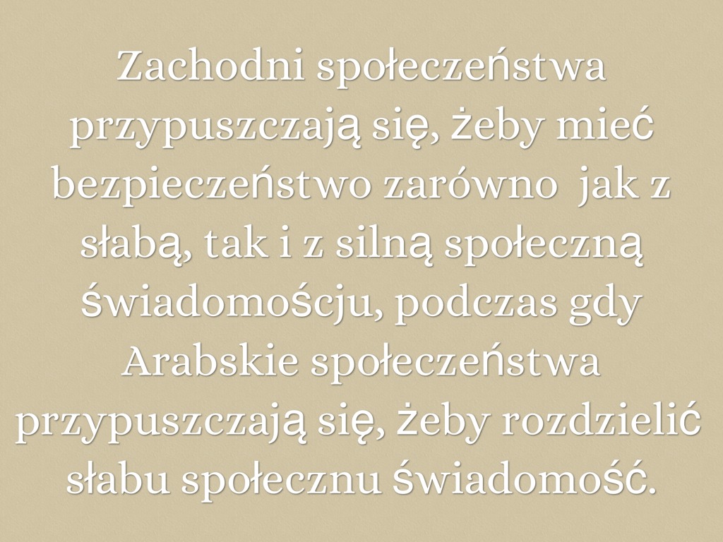 Zachodni społeczeństwa przypuszczają się, żeby mieć bezpieczeństwo zarówno jak z słabą, tak i z silną społeczną świadomoścju, podczas gdy Arabskie społeczeństwa przypuszczają się, żeby rozdzielić słabu społecznu świadomość.