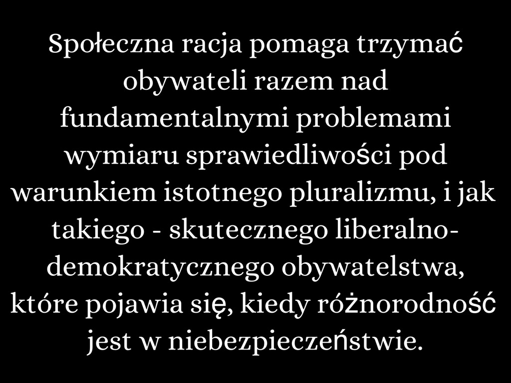 Społeczna racja pomaga trzymać obywateli razem nad fundamentalnymi problemami wymiaru sprawiedliwości pod warunkiem istotnego pluralizmu, i jak takiego - skutecznego liberalno-demokratycznego obywatelstwa, które pojawia się, kiedy różnorodność jest w niebezpieczeństwie.