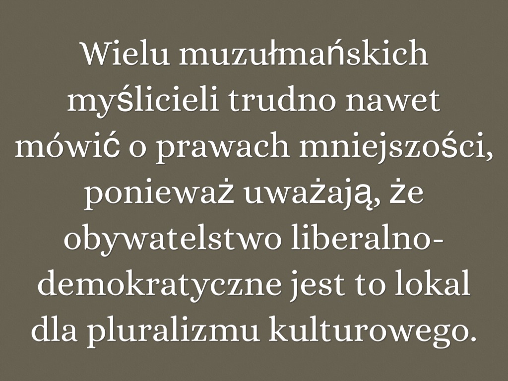 Wielu muzułmańskich myślicieli trudno nawet mówić o prawach mniejszości, ponieważ uważają, że obywatelstwo liberalno-demokratyczne jest to lokal dla pluralizmu kulturowego.