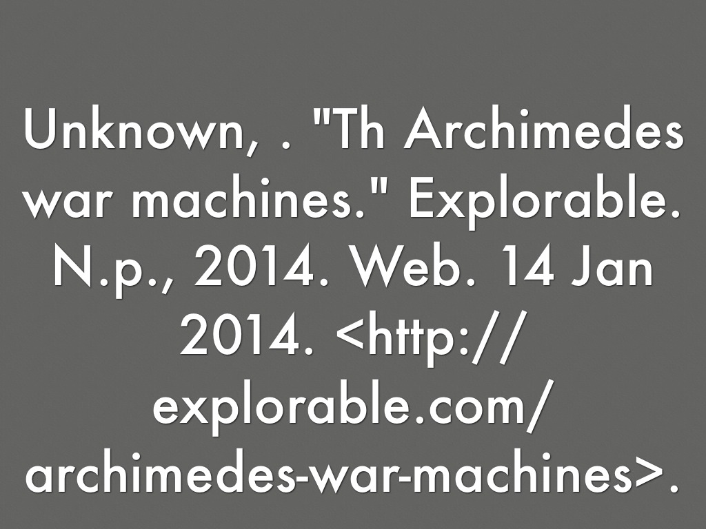 Unknown, . "Th Archimedes war machines." Explorable. N.p., 2014. Web. 14 Jan 2014. .