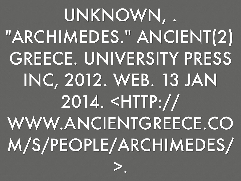 UNKNOWN, . "ARCHIMEDES." ANCIENT(2) GREECE. UNIVERSITY PRESS INC, 2012. WEB. 13 JAN 2014. .