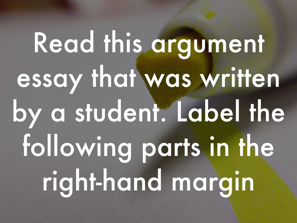 Read this argument essay that was written by a student. Label the following parts in the right-hand margin