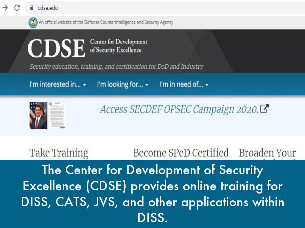 The Center for Development of Security Excellence (CDSE) provides online training for DISS, CATS, JVS, and other applications within DISS.