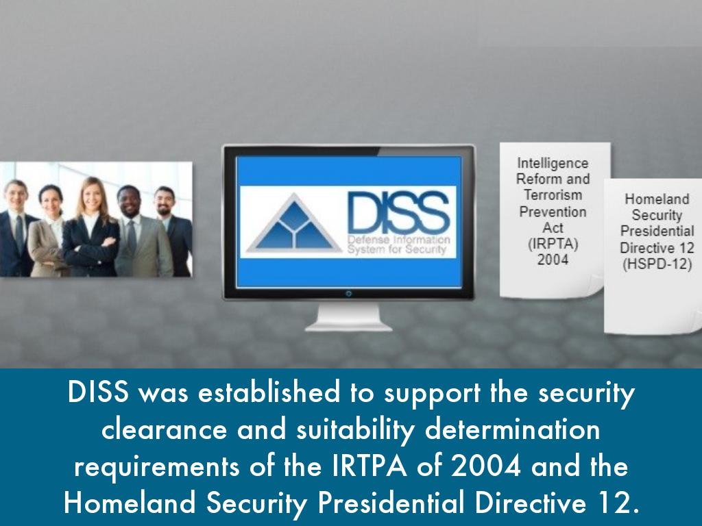 DISS was established to support the security clearance and suitability determination requirements of the IRTPA of 2004 and the Homeland Security Presidential Directive 12.