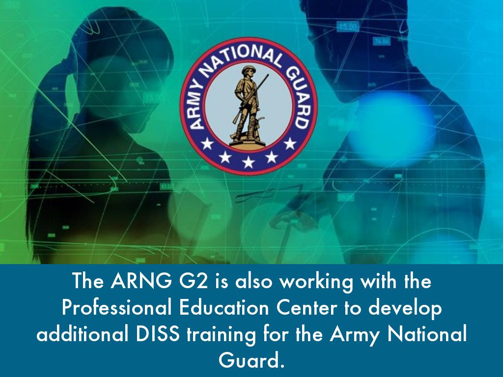The ARNG G2 is also working with the Professional Education Center to develop additional DISS training for the Army National Guard.