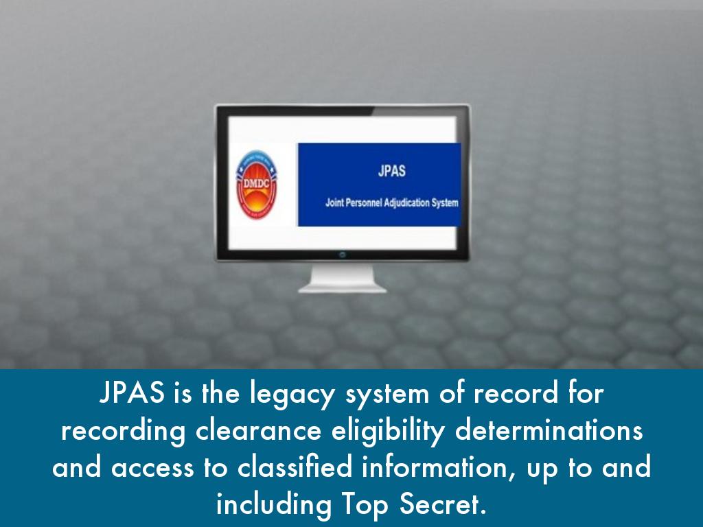 JPAS is the legacy system of record for recording clearance eligibility determinations and access to classified information, up to and including Top Secret.