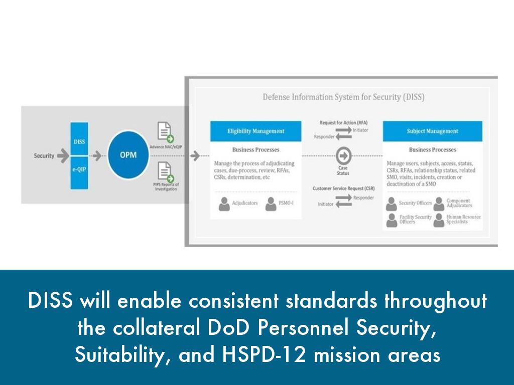 DISS will enable consistent standards throughout the collateral DoD Personnel Security, Suitability, and HSPD-12 mission areas