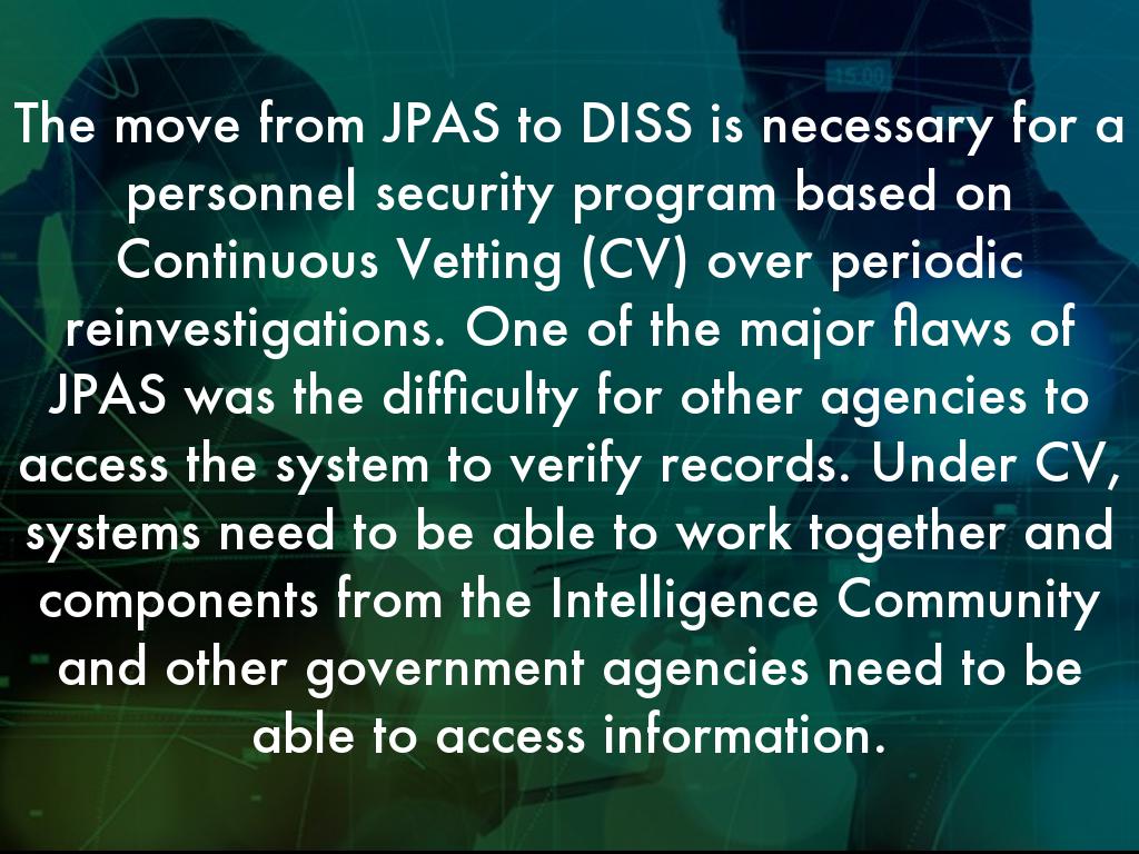 The move from JPAS to DISS is necessary for a personnel security program based on Continuous Vetting (CV) over periodic reinvestigations. One of the major flaws of JPAS was the difficulty for other agencies to access the system to verify records. Under CV, systems need to be able to work together and components from the Intelligence Community and other government agencies need to be able to access information.