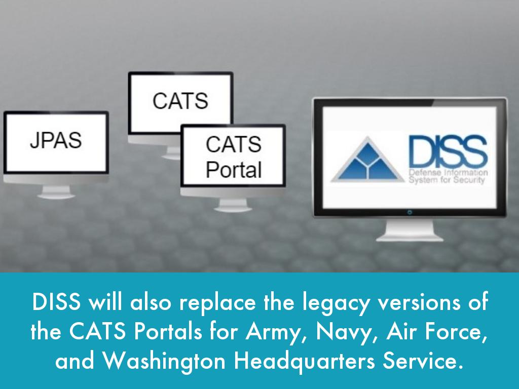 DISS will also replace the legacy versions of the CATS Portals for Army, Navy, Air Force, and Washington Headquarters Service.