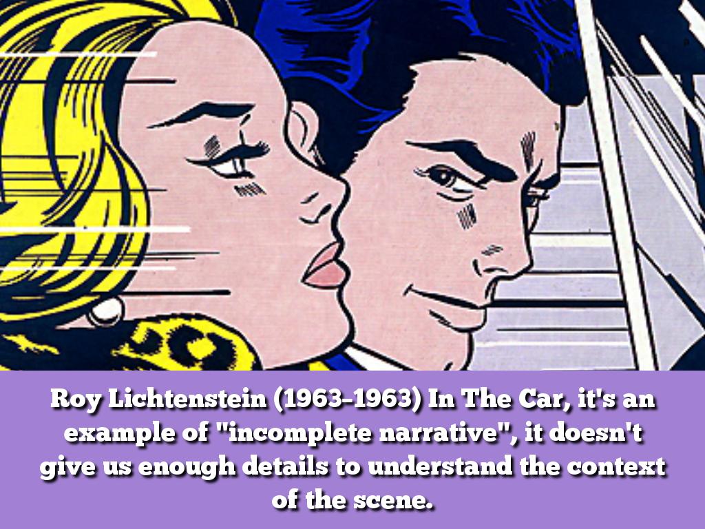 Roy Lichtenstein (1963–1963) In The Car, it's an example of "incomplete narrative", it doesn't give us enough details to understand the context of the scene.