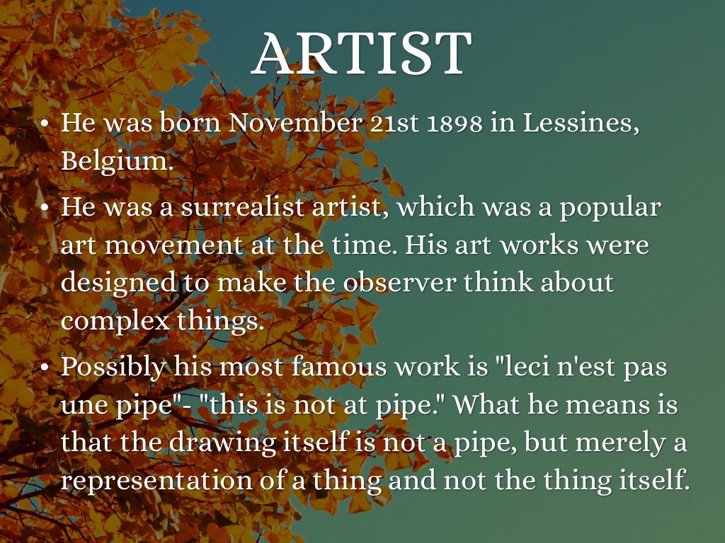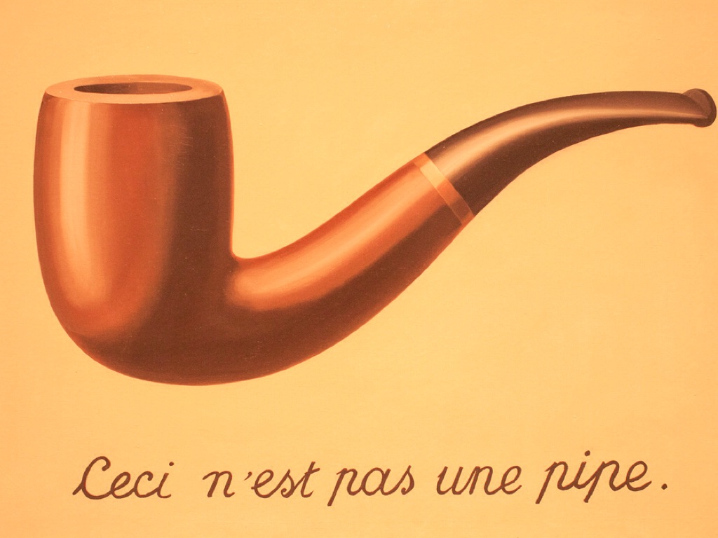 Possibly his most famous work is "leci n'est pas une pipe"- "this is not at pipe." What he means is that the drawing itself is not a pipe, but merely a representation of a thing and not the thing itself.