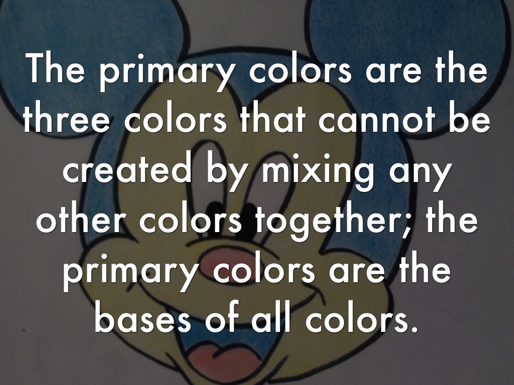 The primary colors are the three colors that cannot be created by mixing any other colors together; the primary colors are the bases of all colors.